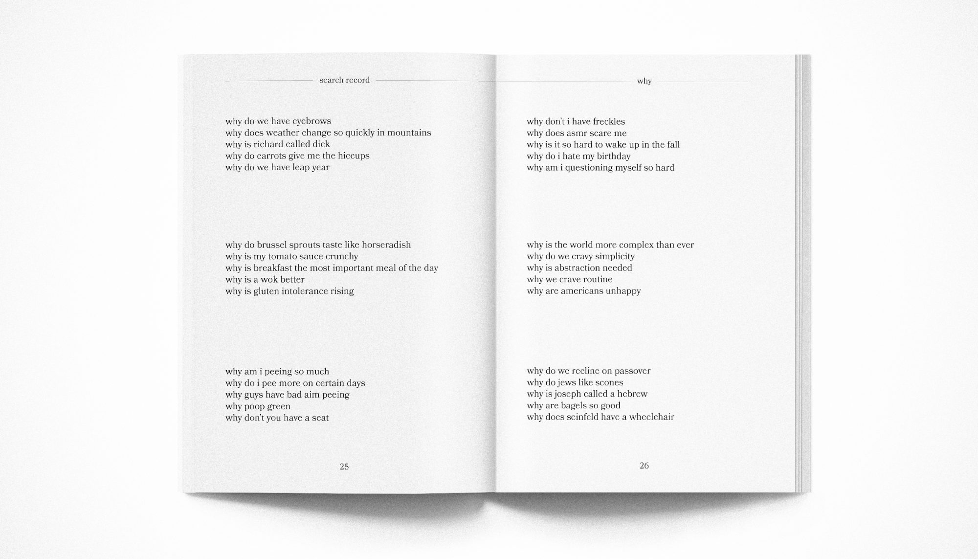 Search Record imagines new contexts for the data left behind in everyday online life. It takes the form of a collection of digital and physical presentations of my Google Search history, as well as a set of web tools that allows users to produce new artifacts from their own histories.