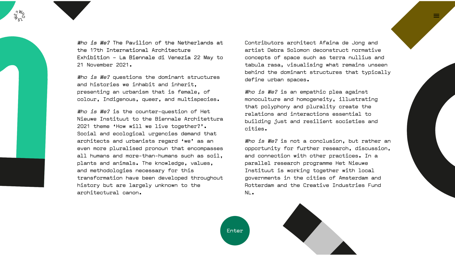 The 2020 Venice Architecture Biennial was delayed one year due to COVID-19 and held in a hybrid format. I worked with RNDR to develop a digital version of the Netherlands' entry, and exhibition called Who Is We?